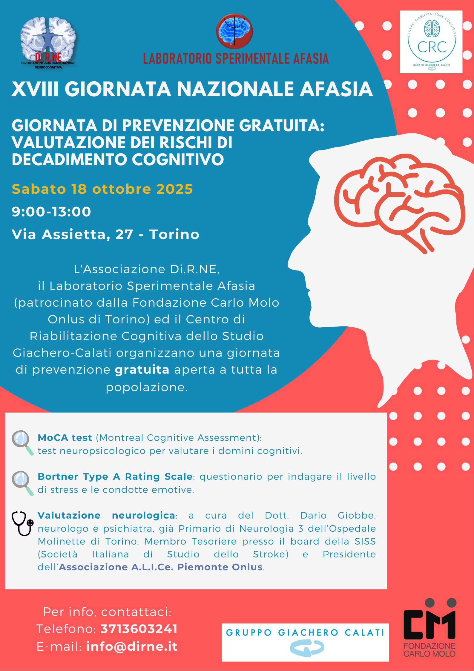 Sabato 18 ottobre 2025, in occasione della XVIII Giornata Nazionale Afasia, l'Associazione Di.R.NE, il Laboratorio Sperimentale Afasia patrocinato dalla Fondazione Carlo Molo Onlus di Torino e il Centro di Riabilitazione Cognitiva dello Studio Giachero Calati organizzano uno screening gratuito aperto a tutta la popolazione.